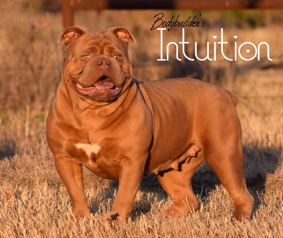 Intuition is one of our “special” creations. She is a littermate to our boy Retro. When we conceived the idea for Intuition and Retro we had some things in mind. We wanted to add some elements that we felt were either lacking or would help us continue to create a better OEB. So we paired our best girl (Audi) with an outside stud named “Heavy.” Heavy comes from some very bloodlines that have a lot of American Bulldog genetics. We love his confirmation and head type and size. To say the pairing of him with Audi was a success is a major understatement!