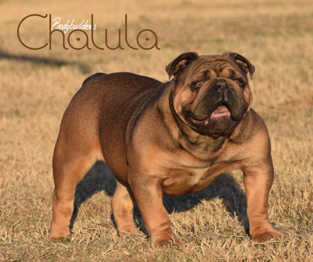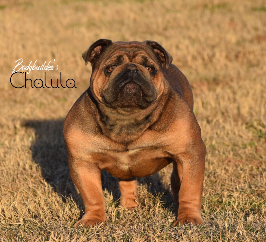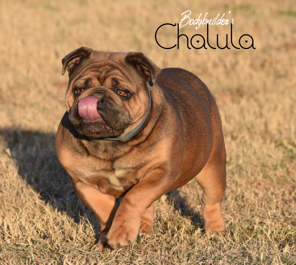 Chalula is one of those dogs that just screams “BULLDOG” when you see her. She is wide, short and has a big round wrinkled head. She brings the “type” that a lot of dogs lack in the olde world. We have big hopes and plans for her.