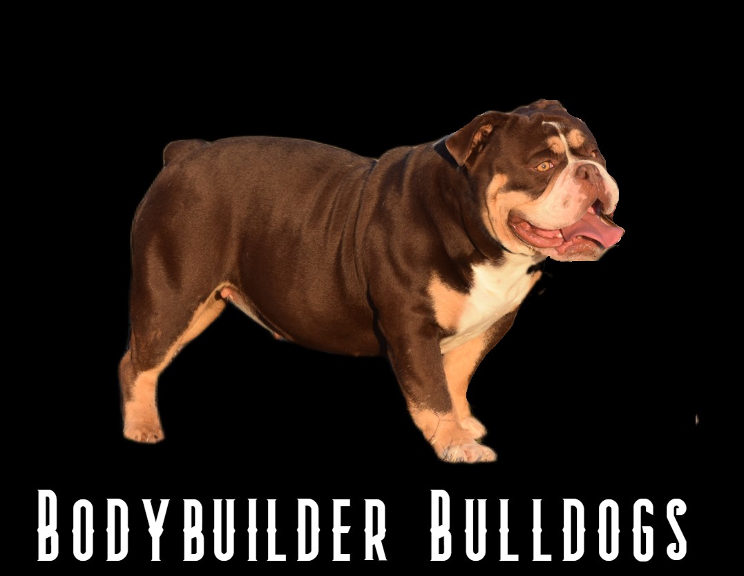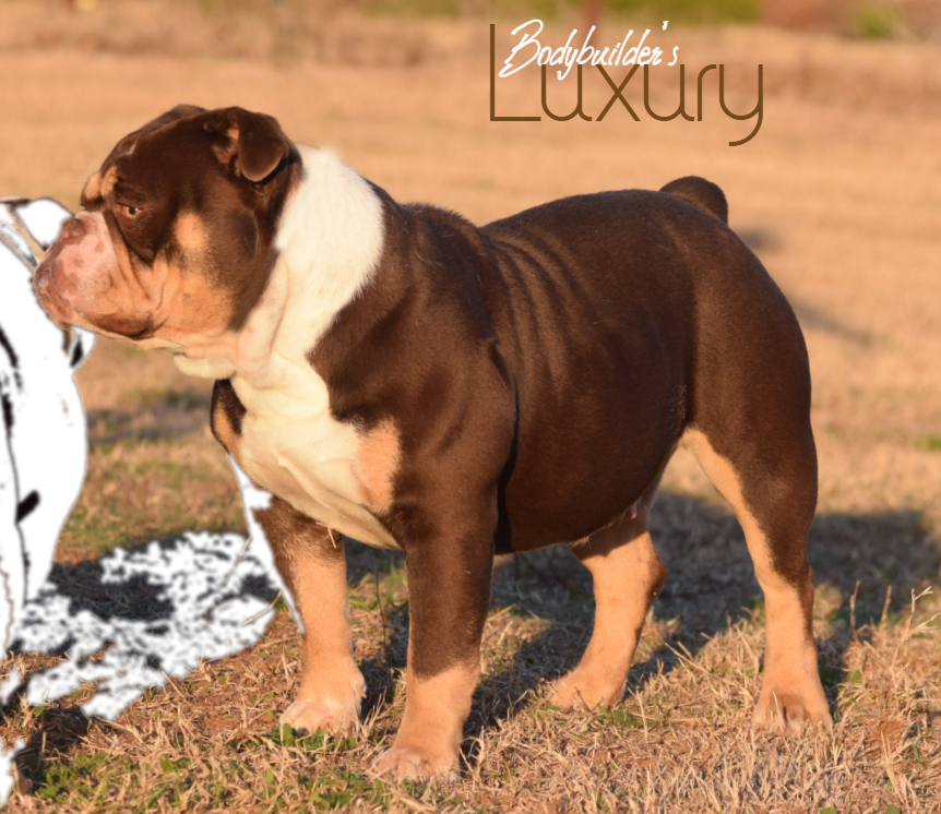 Luxury is our only Chocolate tri dog here at Bodybuilder Bulldogs. Her parents are Destiny and Squats. She has a big beautiful head really nice structure especially here shoulder set and wide rib cage.